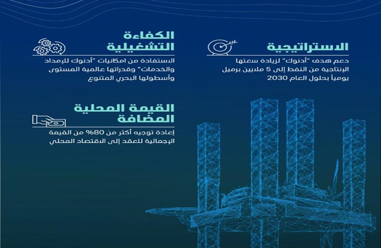 وبهذه المناسبة قال أحمد صقر السويدي، الرئيس التنفيذي لشركة “أدنوك البحرية” : “يسهم هذا العقد الذي تمت ترسيته على شركة ’أدنوك للإمداد والخدمات‘ في دعم جهود تنفيذ خطط ’أدنوك البحرية‘ الرامية لزيادة سعتها الإنتاجية من النفط كما يدعم مباشرةً هدف ’أدنوك‘ الاستراتيجي المتمثل في رفع سعتها الإنتاجية من النفط الخام لتصل إلى 5 ملايين برميل يومياً بحلول العام 2030. وتمتلك ’أدنوك للإمداد والخدمات‘ سجلاً حافلاً وخبرة طويلة في قطاع النفط والغاز، ويتيح لنا هذا التعاون الاستفادة من خدمات المنصات ذاتية الحركة في تعزيز مرونة عملياتنا التشغيلية، فضلاً عن خفض التكاليف مما يساهم في ترسيخ مكانة ’أدنوك‘ الرائدة ضمن منتجي النفط الأقل تكلفة وكثافة في مستويات انبعاثات الكربون. وسيتم إعادة توجيه نسبة كبيرة من قيمة هذا العقد إلى الاقتصاد المحلي من خلال برنامج ’أدنوك‘ لتعزيز القيمة المحلية المضافة، مما يسهم في خلق المزيد من فرص العمل ويدفع عجلة التنمية والتنويع الاقتصادي بالدولة تماشياً مع توجيهات قيادتنا الرشيدة».
