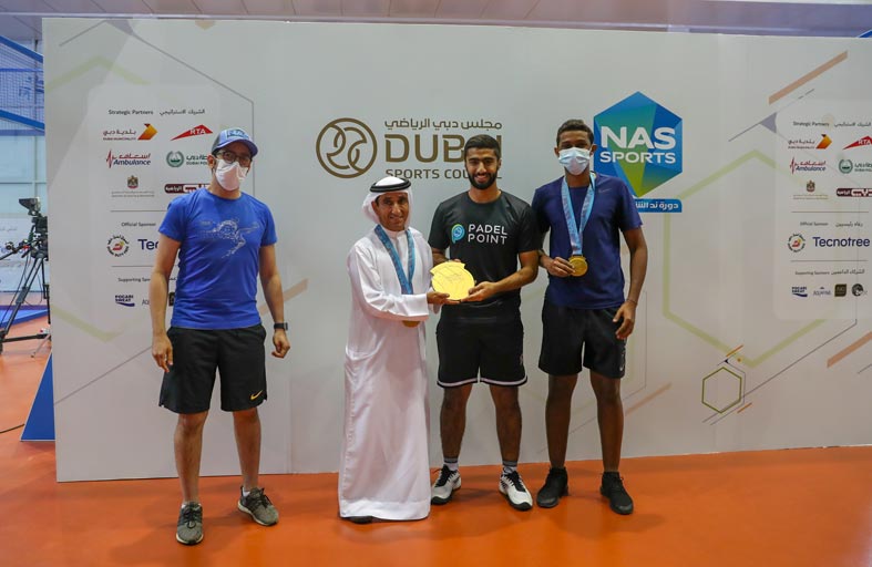 وجاءت المباراة قوية في المجموعة الأولى من قبل الهاجري وهدي اللذين استطاعا الفوز بنتيجتها 6-3 لكن إصرار فريق "أنكل سعيد" على التدارك مكنه من انتزاع نتيجة المجموعة الثانية 6-4 قبل أن يضع كل خبرته لاختطاف نتيجة المجموعة الثالثة التي جاءت متكافئة وبالرغم من التقدم الثنائي الهاجري وهدّي 5-4 تمكن "أنكل سعيد" من إدراك التعادل 5-5 ثم التقدم 6-5 وحسم النتيجة النهائية 7-5. كما نجح الثنائي المكون من خافير غارسيا وألكسندر فاركوهارسن في تحقيق لقب الفئة الذهبية عقب فوزهما في المباراة النهائية على حساب مارتن نوتشيزي وغيليرمو فيلافاني بمجموعتين دون رد بواقع 6-2 و6-3. وحصل الثنائي ايميليو ميساس وماسون خافير على المركز الثالث في الفئة الذهبية بعد تغلبهما في المباراة تحديد المركزين الثالث والرابع على الثنائي المكون من سعيد المري وكلاوديو بوباديلا بمجموعتين دون رد بواقع 6-1 و6-2. وبنهاية المباريات، قام الشيخ سعيد بن مكتوم بن جمعة آل مكتوم رئيس اتحاد الإمارات للبادل تنس بتتويج أبطال وبطلات النسخة الحالية للبادل تنس التي أقيمت في 4 فئات هي الفئة الذهبية للرجال وفئتين برونزيتين للرجال والسيدات والفئة الدولية. وأثنى الشيخ سعيد بن مكتوم بن جمعة آل مكتوم على المستويات القوية التي ظهرت عليها البطولة في كافة الفئات وبالمشاركة الواسعة، ما يؤكد التطور الذي تشهده اللعبة في الإمارات، مشيرا إلى أن الملاعب المنتشرة في مختلف مناطق الدولة و التدريبات المتواصلة على مدار العام والبرامج التي يتم تنفيذها من قبل اتحاد الإمارات للبادل تنس سواء في مجمع ند الشبا أو البطولات التي تقام في الأندية الأخرى، تساهم في رفع المستوى العام للعبة، وقال: المستوى الفني للمباريات جاء قويا هذا العام حتى أني شعرت بقليل من الخوف قبل خوض المباراة النهائية لكننا نجحنا في كسر هذا الحاجز وتقديم الأداء المطلوب الذي مهد لنا طريق الفوز باللقب وأشكر جميع اللاعبين على المستويات القوية التي قدموها.