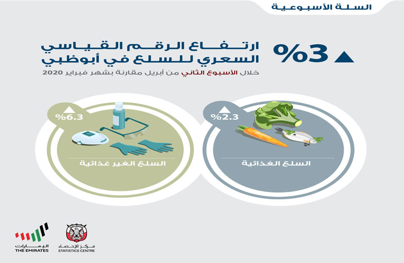 كشف تقرير السلة الأسبوعية الصادر مؤخراً عن مركز الإحصاء أبوظبي عن انخفاض الرقم القياسي السعري للسلع الغذائية وغير الغذائية الأسبوعية بنسبة 0.7% ليصل إلى 103.0% في الأسبوع الثاني من أبريل مقارنة مع 103.7% خلال الأسبوع الأول من الشهر نفسه. وارتفع بنسبة 3.0% خلال الأسبوع الثاني من أبريل 2020، مقارنة بشهر فبراير 2020 على اعتبار بأنه شهر مرجعي. وخلال الأسبوع الثاني من أبريل 2020 ومقارنة بشهر فبراير 2020، ارتفع الرقم القياسي السعري للسلع الغذائية بنسبة 2.3%، وللسلع غير الغذائية بنسبة 6.3%.