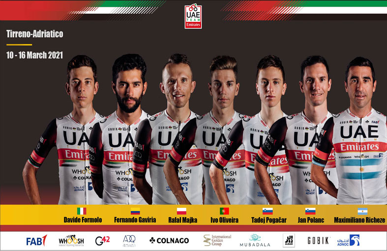 وسيقود تادي بوجاتشار تشكيلة فريق الإمارات، حيث يتطلع إلى إظهار قوته في المراحل الجبلية بهدف الفوز بلقب التصنيف العام من جديد هذا الموسم، بينما سيتولى زميله فيرناندو جافيريا مهمة سباقات السرعة. وتضم التشكيلة كلاً من الإيطالي ديفيد فورمولو، والسلوفيني تادي بوجاتشار ومواطنه يان بولانك، والبرتغالي رافال مايكا ومواطنه إيفو أوليفييرا، والأرجنتيني ماكس ريتشيزي، فضلاً عن الكولومبي فيرناندو جافيريا .. وسيتولى مدير الفريق ماتين فيرنانديز والمديران الرياضيان أندريه هاوبتمان ومانويل موري مهمة قيادة تشكيلة الفريق في السباق.
