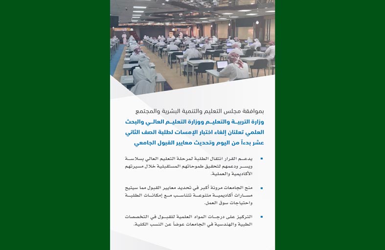 ودعت وزارتا التربية والتعليم، والتعليم العالي والبحث العلمي، الطلبة وأولياء الأمور إلى ضرورة التعرف على اشتراطات القبول الخاصة بكل جامعة وبحسب التخصص الدراسي الذي يرغب الطالب في دراسته، من خلال التواصل المباشر مع مؤسسات التعليم العالي المعنية، وتلبية تلك المتطلبات وفق القواعد والنظم المطبقة، موضحةً أن إلغاء الاختبار لن يؤثر على متطلبات معادلة شهادات مناهج المدارس الخاصة سوى تلك التي تطبق المنهاج الأميركي، حيث يجب على الطلبة في هذا المنهاج التسجيل لتقديم الاختبارات المعيارية البديلة لاختبار الإمسات مثل اختبار السات (SAT) لمادة الرياضيات والتوفل (TOEFL) لمادة اللغة الإنجليزية، وغيرها من المتطلبات ذات الصلة بالقبول.