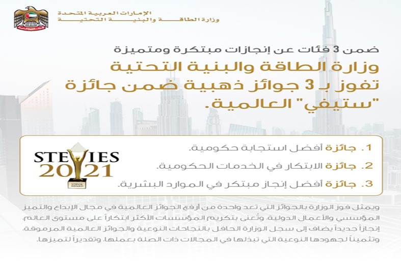 وقالت وزارة الطاقة والبنية التحتية:” إن الفوز بهذه الجوائز يعتبر إنجازاً جديداً يضاف إلى سجل الوزارة الحافل بالنجاحات النوعية والجوائز العالمية المرموقة، التي تؤكد تميزها وتطبيقها الأمثل لأفضل المبادرات والحلول المبتكرة في مجال عملها، خاصة أن جوائز ستيفي العالمية تتمتع بسمعة دولية ومشهود لها بالشفافية والحيادية ومعاييرها الصارمة، الأمر الذي يؤكد نهج الوزارة الرامي إلى تعزيز المسيرة نحو الخمسين عاماً المقبلة، وصولاً إلى تحقيق مئوية الإمارات 2071».