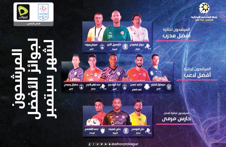 أعلنت رابطة المحترفين الإماراتية أسماء المرشحين لجوائز الأفضل الشهرية في دوري "أدنوك" للمحترفين، برعاية "اتصالات"، عن فئات أفضل لاعب، وحارس مرمى، ومدرب، لشهر سبتمبر الماضي و الذي شهد إقامة أربع جولات، اتسمت بالقوة والأداء المميز.
