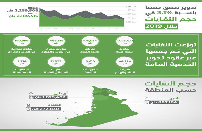 كشف مركز أبوظبي لإدارة النفايات – تدوير أن إجمالي حجم النفايات التي تم جمعها من كافة مناطق إمارة أبوظبي خلال 2019 قد تراجع إلى 2,189,416.90 طن مقارنة بـ 2,259,508.64 طن في 2018 بما يمثل انخفاضاً بنسبة 3.10 بالمائة وذلك بفضل الجهود الحثيثة التي بذلها المركز خلال الفترة الماضية لتقليل كمية النفايات بمختلف أشكالها.