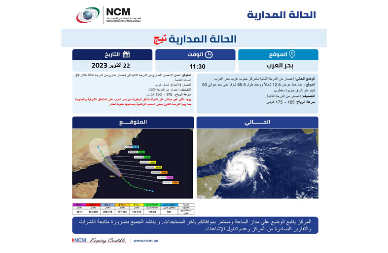 وتوقع المركز من خلال النماذج العددية والتقارير الصادرة من مركز مراقبة الأعاصير الاقليمي استمرار حركته باتجاه الشمال الغربي ، وتعمق الإعصار المداري من الدرجة الثانية إلى إعصار مداري من الدرجة الثالثة خلال 24 الساعة القادمة وتتراوح سرعة الرياح ما بين 180 -200 كم-الساعة..يصاحبها غطاء سحابي تتخلله السحب الركامية الممطرة. وفيما يتعلق بتأثيره على الدولة قال المركز "يوجد تأثير غير مباشر على الدولة بتدفق الرطوبة من بحر العرب على المناطق الشرقية والجنوبية مما يهيىء الفرصة لتكون بعض السحب الركامية مصحوبة بسقوط أمطار.