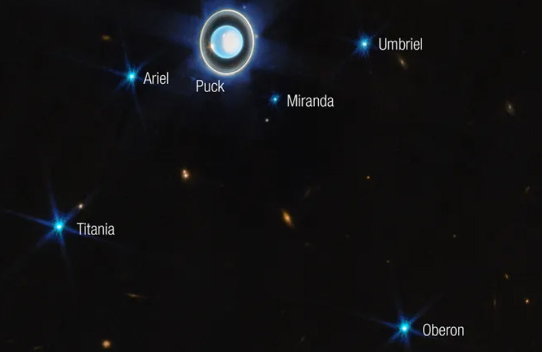 كما التقط التلسكوب ويب أيضًا العديد من الأقمار السبعة والعشرين المعروفة لأورانوس، ومعظمها صغير جدًا وخافت بحيث لا يمكن رؤيتها بشكل دقيق، ولكن تم تحديد ستة أقمار سطوعًا في إحدى الصور التي كانت تعرض لمدة 12 دقيقة فقط.