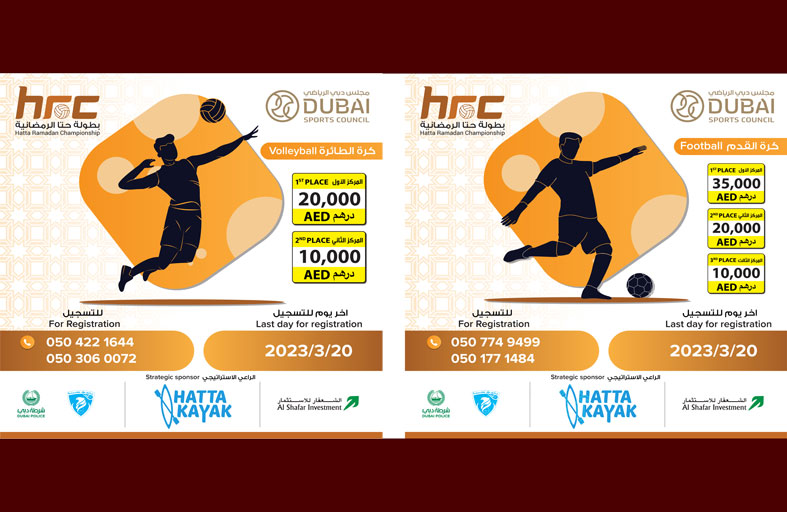 وتنطلق بطولتي الطائرة والقدم يوم 2 رمضان، ويشارك في بطولة كرة قدم الصالات 16 فريقًا سيتم تقسيمهم إلى 4 مجموعات في البطولة التي تقام بالتعاون مع نادي حتا الثقافي، كما يشارك في بطولة الكرة الطائرة 8 فرق، فيما يقام سباق الجري يوم 9 رمضان ويتضمن التنافس في 4 فئات هي: الرجال والسيدات لمسافة 6 كيلومترات، والبنين والبنات لمسافة 2 كيلومتر.