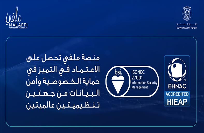 أعلنت "ملفّي"، أول منصة مبتكرة لتبادل المعلومات الصحية على مستوى المنطقة، وإحدى المبادرات الإستراتيجية لدائرة الصحة - أبوظبي، اليوم عن حصولها على الاعتماد من هيئتين عالميتين وهما، المنظمة الدولية للمعايير ولجنة اعتماد شبكة الرعاية الصحية الإلكترونية EHNAC حيث يؤكد هذا الانجاز تميز المنصة بمعايير خصوصية البيانات وأفضل الممارسات الأمنية.