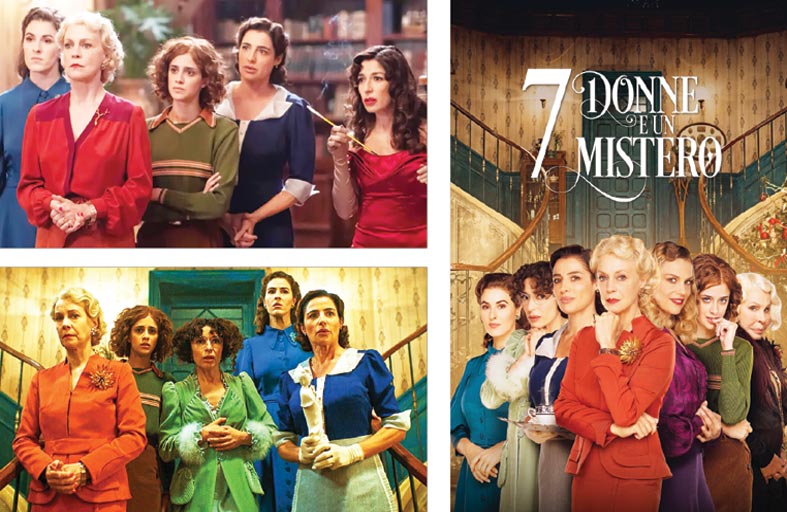 مناخ آغاتا كريستي ماثلٌ في "7 نساء وغموض"، المستوحى من "8 نساء" (2002) للفرنسي فرنسوا أوزون، المرتكز أصلاً على مسرحية "8 نساء" (1958) للفرنسي روبير توما. نَفَسٌ هيتشكوكي أيضاً، يظهر في الديكور والمناخ العام والميل إلى عتمةٍ وثلجٍ (الغالبية الساحقة من الأحداث تجري ليلاً)، إلى شيءٍ من حَبْس الأنفاس، وهذا كلّه مُطعَّم بكلّ ما لن يُثير خوفاً وقلقاً كبيرين، بل ضحكاً وتسلية.