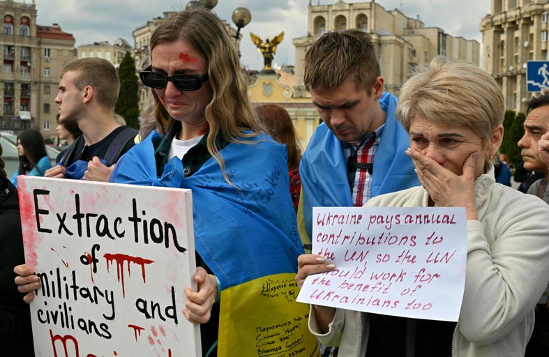 ويتم لف الجثث في أكياس بلاستيكية وتتعفن بسبب توقف أنظمة التبريد. لكن أفراد كتيبة آزوف يريدون خصوصا ألا تقع هذه الجثامين بأيدي القوات الروسية. وقالت “يحملون معهم الجثث في كل مكان تقريبا».