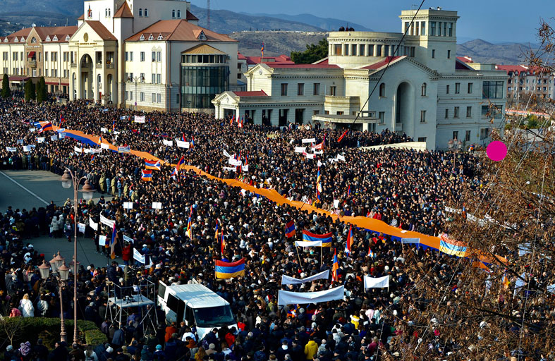 وتجمع نحو ستة آلاف متظاهر صباح الجمعة في الساحة الرئيسية لهذه المدينة. ويطرح اغلاق ممر لاتشين خطر وقوع أزمة إنسانية كبيرة في ناغورني قره باغ على ما تؤكد أرمينيا.