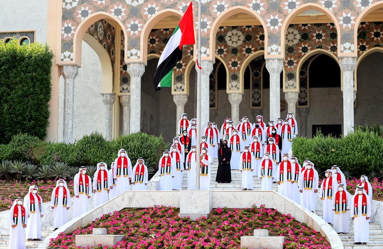 بعد ذلك، رفع معالي أحمد محمد الحميري، علم الدولة على سارية قصر الرئاسة بالتزامن مع أداء السلام الوطني.