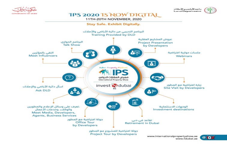 أعلنت دائرة الأراضي والأملاك في دبي عن انطلاق النسخة الافتراضية الأولى من معرض العقارات الدولي خلال الفترة من 11 - 20 نوفمبر 2020، ليكون أكبر منصة لبيع وشراء العقارات في الشرق الأوسط لسوق العقارات المحلي والأسواق الدولية، وذلك بالشراكة مع مبادرة “استثمر في عقارات دبي».