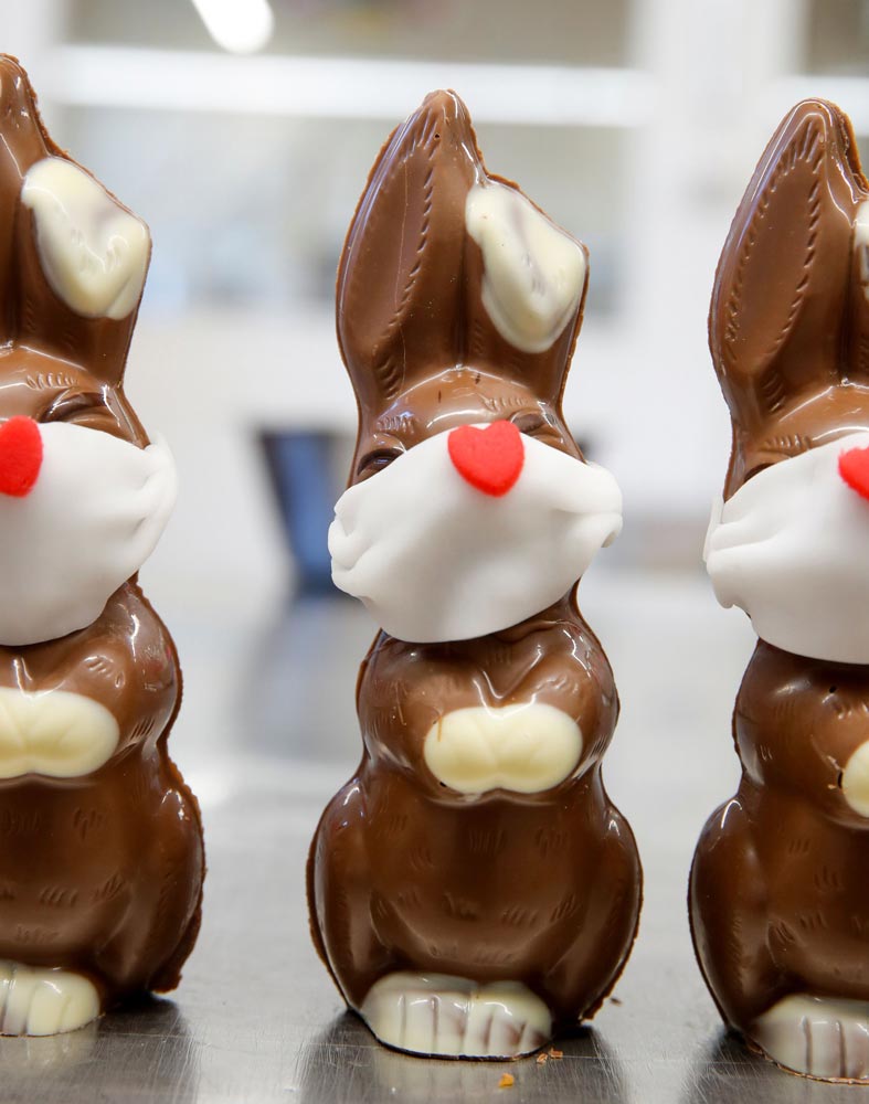 أرانب عيد الفصح من الشوكولاتة التي ترتدي أقنعة واقية تظهر بأحد المخابز في برن، سويسرا. (رويترز)