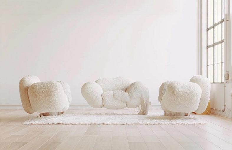 تم تصميم هذه الأريكة لتبدو وكأنها سحابة عائمة تسبح في الهواء مع قاعدة من جانب واحد في حين لا تستند على أي شيء من الطرف الآخر.
