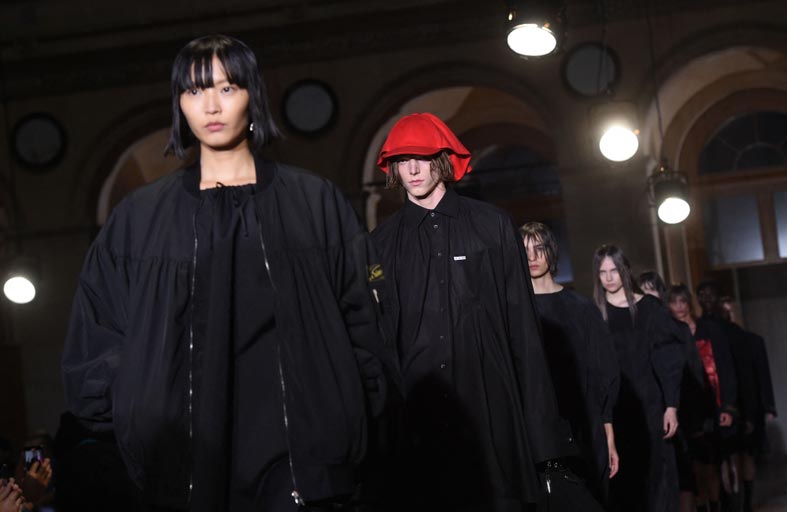 وجعل المدير الفني لدار "بالمان" أوليفييه روستينغ في تشكيلته الأربعاء الرجال يرتدون تصاميم تتميز بطياتها، مطبوعة بنقاط صغيرة أو مكشوفة عند الصدر، وألبس النساء التصاميم نفسها تقريبا في عرض في السين موزيكال في بولونيا-بيلانكور، حيث مرت ناومي كامبل وكارلا بروني وسواهما على منصات عرض الازياء في تسعينات القرن العشرين.