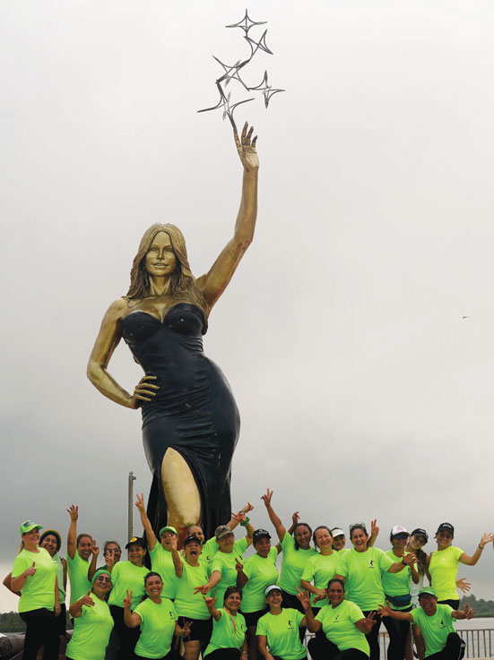 أشخاص يلتقطون صورة مع تمثال للممثلة الكولومبية صوفيا فيرجارا في ماليكون في بارانكويلا، كولومبيا. ا ف ب