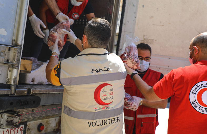 ونفذت الهيئة مشروع الأضاحي في 4 قارات للحد من التداعيات الإنسانية لنقص الغذاء في تلك الدول، ووجدت أضاحي الهلال الأحمر طريقها للفقراء والمحتاجين في أحيائهم النائية، وللاجئين والنازحين في مخيماتهم التي تفتقر لأبسط مقومات الحياة وللمشردين في العراء دون مأوى أو غذاء. وباشرت الهيئة خلال أيام العيد توزيع لحوم الأضاحي على الأسر المتعففة والشرائح المستهدفة داخل الدولة عبر مراكزها في أبوظبي والعين ومنطقة الظفرة ودبي والشارقة وعجمان وأم القيوين ورأس الخيمة والفجيرة، وخارجيا عبر مكاتبها وسفارات الدولة في عدد من الدول وبالتعاون والتنسيق مع بعض الجمعيات الخيرية والمنظمات الإنسانية في الدول الأخرى.