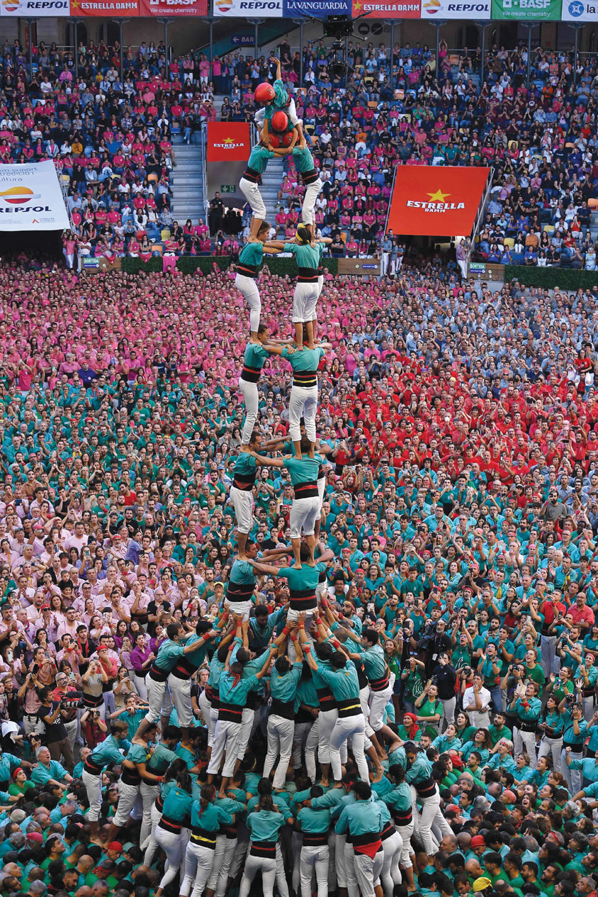 أعضاء فريق بهلواني يشكلون «كاستيل» «برج بشري» خلال النسخة الثامنة والعشرين من مسابقة «كاستيلز» في ساحة تاراكو في تاراغونا بإسبانيا. ا ف ب