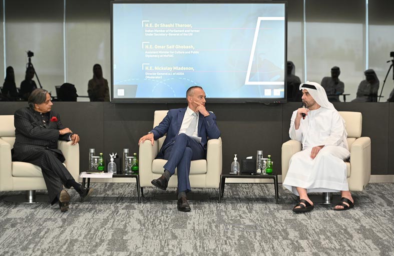 وأدار الحلقة النقاشية التي جاءت ضمن الحوارات الدبلوماسية التي تنظمها الأكاديمية بشكل دوري، سعادة نيكولاي ملادينوف، مدير عام أكاديمية أنور قرقاش الدبلوماسية بالإنابة، وشارك فيها سعادة الدكتور شاشي ثارور عضو البرلمان الهندي ووكيل الأمين العام السابق للأمم المتحدة؛ إلى جانب سعادة عمر سيف غباش مساعد وزير الخارجية والتعاون الدولي للشؤون الثقافية والدبلوماسية العامة.