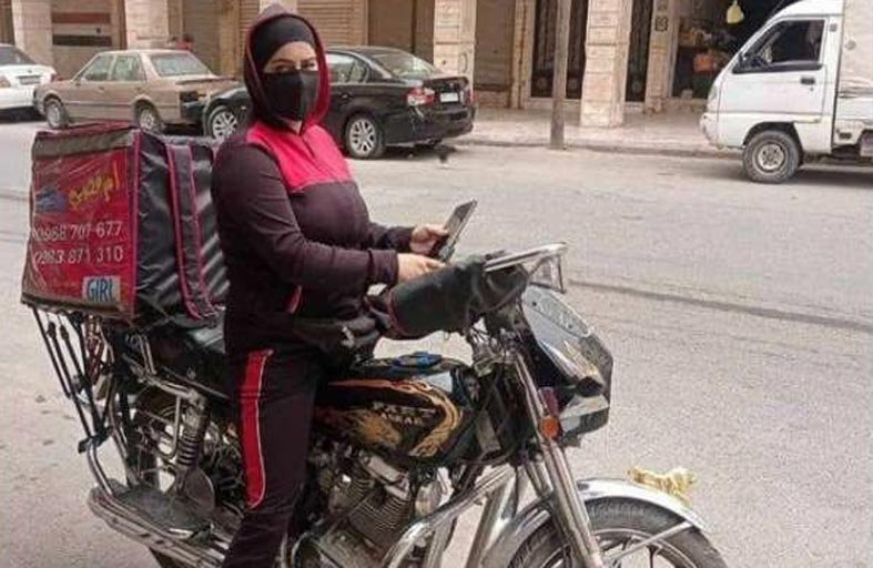 تعدّ «أم قصي» أول امرأة سورية تعمل على دراجة توصيل "دليفري"، لإيصال طلبات الزبائن من المطاعم والسوبرماركات إلى منازلهم.