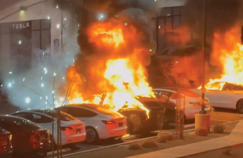 تعرضت 5 سيارات تسلا لأضرار كبيرة إثر اندلاع حريق في مركز "تسلا لحوادث التصادم" في لاس فيغاس، في أحدث حلقة من سلسلة حوادث استهدفت شركة السيارات الكهربائية، وفقاً للشرطة الأمريكية. ووفقاً لما ذكرته صحيفة "ديلي ميل" فقد صرح دوري كورين، مساعد قائد شرطة لاس فيغاس الكبرى قائلاً: "كان هذا هجوماً مُستهدفاً منشأة تابعة لشركة تسلا".