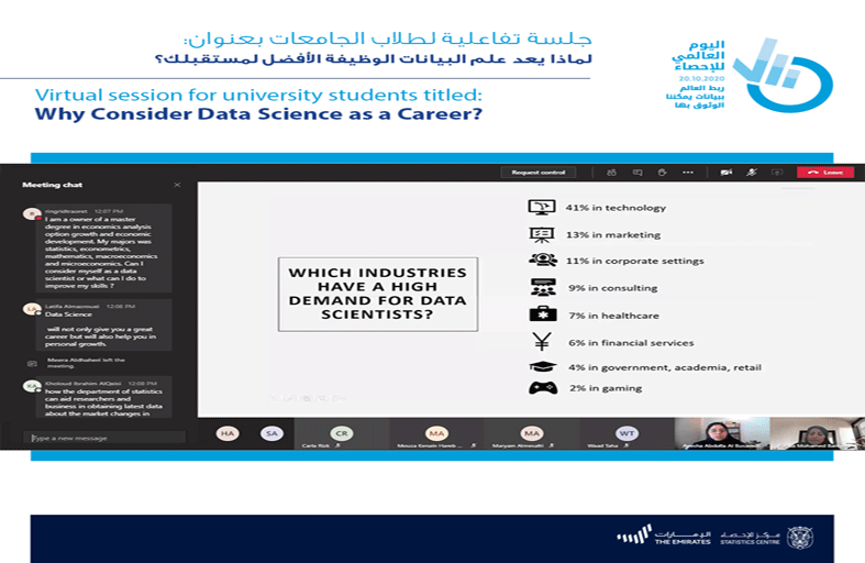 نظم معهد التدريب الإحصائي التابع لمركز الإحصاء – أبوظبي بالتزامن مع اليوم العالمي الثالث للإحصاء امس جلسة تفاعلية لطلاب الجامعات المحلية والدولية تحت عنوان « لماذا يعد علم البيانات الوظيفة الأفضل لمستقبلك؟» وذلك عبر تقنيات الاتصال المرئي.