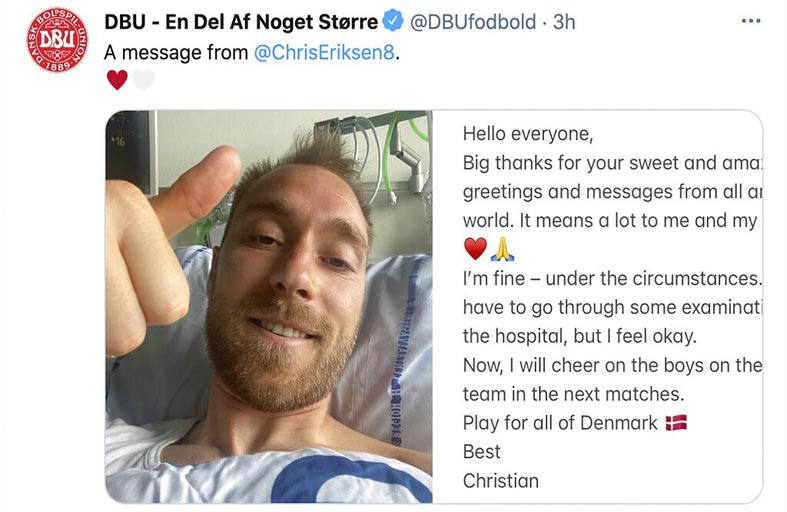وكتب إريكسن تحت صورة له وهو يبتسم على سريره في المستشفى "لا يزال يتعين علي إجراء بعض الفحوصات في المستشفى لكني أشعر أنني بحالة جيدة". وأضاف اللاعب البالغ من العمر 29 عامًا والذي شكر جماهيره على كل رسائلهم "الآن سأدعم لاعبي المنتخب الدنماركي في المباريات القادمة. العبوا من أجل الدنمارك بأسرها". وسقط إريكسن المتوج مع إنتر ميلان بلقب الدوري الإيطالي، فجأة على الأرض عندما كان يستقبل الكرة من رمية تماس قريبة قبل نهاية الشوط الأول بثلاث دقائق.
