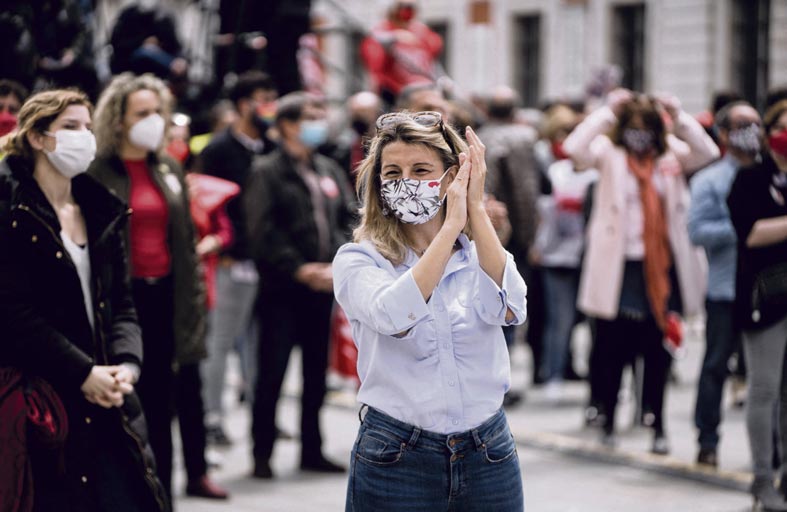 ويعتقد بابلو إغليسياس أن زمن زعامته قد انتهى، وأن الوقت قد حان لحوكمة نسائية: لقد أعاد تسمية تشكيلته إلى المؤنث -أصبح بوديموس يونيداس بوديموس ("متحدون، نستطيع") -وقد سلّم المشعل إلى يولاندا دياز، وزيرة العمل الحالية، ورفيقته إيرين مونتيرو، كبيرة الكهنة للكتابة الشاملة، التي تتولى حقيبة التكافؤ.