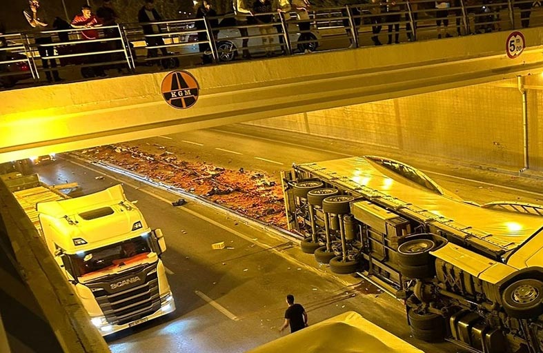 وتسبب الحادث بتناثر الطماطم على الطريق، بالقرب من نفق منطقة كارا بينار في قونية، ما دفع الشرطة لإغلاق الطريق بشكل مؤقت، قبل إعادة فتحه مجدداً بعد نقل الشاحنة من المكان وتنظيف الطريق من ثمار الطماطم.