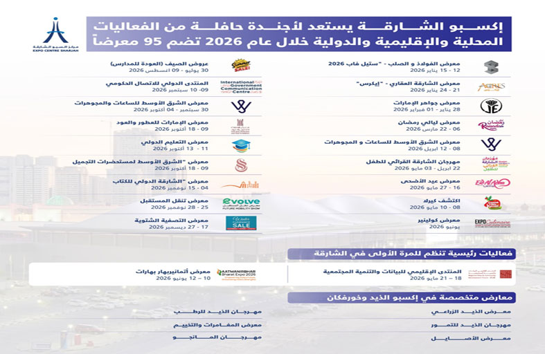 كما تتضمن أجندة إكسبو الشارقة لعام 2026 فعاليات رئيسية تنظم للمرة الأولى في الشارقة، من أبرزها المنتدى الإقليمي للبيانات والتنمية المجتمعية خلال الفترة من 18 إلى 21 مايو، ومعرض "أتمانير بهارات" خلال الفترة من 10 إلى 12 يونيو إلى جانب سلسلة من الأحداث التي ينظمها إكسبو الشارقة سنوياً من أبرزها معرض إكسبو كولينير و"معرض هايف للأثاث" الذي يجمع نخبة من المصممين العالميين والعلامات التجارية لعرض أحدث ابتكاراتهم في عالم الأثاث والديكور المنزلي و"معرض الإمارات للإطارات الصينية" المتخصص في قطاع الإطارات وقطع غيار السيارات ويختتم المركز فعالياته للنصف الأول من عام 2026 بمعرض التخفيضات الكبرى ومعرض العودة للمدارس.