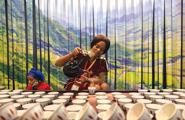 تُمثل مراسم إعداد القهوة، والتي تنطوي على الطقوس المُتمثلة بعملية تجهيز حبوب البن الخام غير المغسولة انتهاء إلى صبها في فناجين القهوة، أهم مناسبة اجتماعية في العديد من القرى في إثيوبيا، فعندما تتلقى دعوة لحضور مراسم إعداد القهوة، فإنْ دَلَّ هذا الأمرُ علَى شَيء فإنما يَدُلُّ على الاحترام والصداقة. يأخذ جناح إثيوبيا زواره في رحلة تمكنهم من الاطلاع على عملية زراعة القهوة لدى السكان الأصليين ابتداء من البذور وصولا إلى الكوب، وذلك من خلال عرض مُقدم على شاشة تفاعلية، يصطحب الزوار في نهاية الرحلة إلى منطقة "أصلنا"، وهي حديقة مزروعة بزنابق الكالا - الزهرة الوطنية الإثيوبية – حيث يتمكنون في نهاية هذه الرحلة الملهمة من الاستمتاع بمراسم تحضير وتقديم القهوة التقليدية.