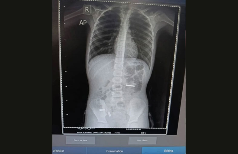 في حادثة طبية غير معتادة، استقبلت مستشفى حميات الغردقة في مصر، حالة طارئة لطفلة تبلغ من العمر 9 سنوات، تعاني من آلام حادة في المعدة، فيما كشفت الفحوصات الأولية عن مفاجأة، حول وجود جسم معدني غريب داخل الأمعاء. وبحسب تقارير محلية، خضعت الطفلة لأشعة دقيقة، أظهرت بوضوح وجود جسم صلب في المسار الهضمي، دفعت الفريق الطبي لتجهيز الطفلة فوراً لدخول غرفة العمليات. وخلال ساعة واحدة فقط، تمكّن الفريق من استخراج المسمار المعدني، والذي بلغ طوله 3 سنتيمترات، وانتهت العملية بمنتهى الدقة، مع الحرص الشديد على تجنب أي ضرر أو مضاعفات للجهاز الهضمي. وبعد انتهاء العملية، خرجت الطفلة من غرفة العمليات إلى قسم الملاحظة بحالة مستقرة، حيث وُضعت تحت المراقبة الطبية الدقيقة للتأكد من سلامة وظائف الجهاز الهضمي واستقرار وضعها الصحي.