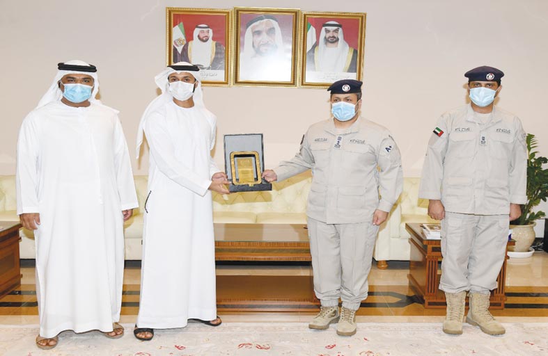 والتقى الوفد اللواء سالم شاهين النعيمي مدير قطاع الموارد البشرية بشرطة أبوظبي وأثنى على زيارتهم مؤكداً اهتمام القيادة الشرطية بالارتقاء بمنظومة الرياضة والمشاركات الخارجية وتعزيز أوجه التعاون في المجالات ذات الاهتمام المشترك. وقدم سعادة عبد الله ناصر الجنيبي رئيس رابطة المحترفين النائب الاول رئيس اتحاد الإمارات لكرة القدم والسيد سالم علي الشامسي عضو مجلس ادارة اتحاد الكرة درعاً تذكارية لشرطة أبوظبي ومديرية شرطة منطقة العين بحضور العقيد مبارك سيف السبوسي مدير مديرية منطقة العين وعدد من الضباط .