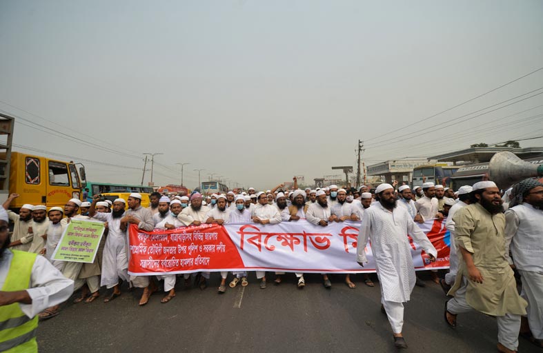 وأكد المتحدث باسم الجماعة زكريا نعمان الفيضي أن 10 آلاف طالب في المدرسة القرآنية في هاثازاري نزلوا إلى الشارع وأغلقوا طريقا سريعا رئيسيا يربط ميناء البلدة بالمناطق النائية.