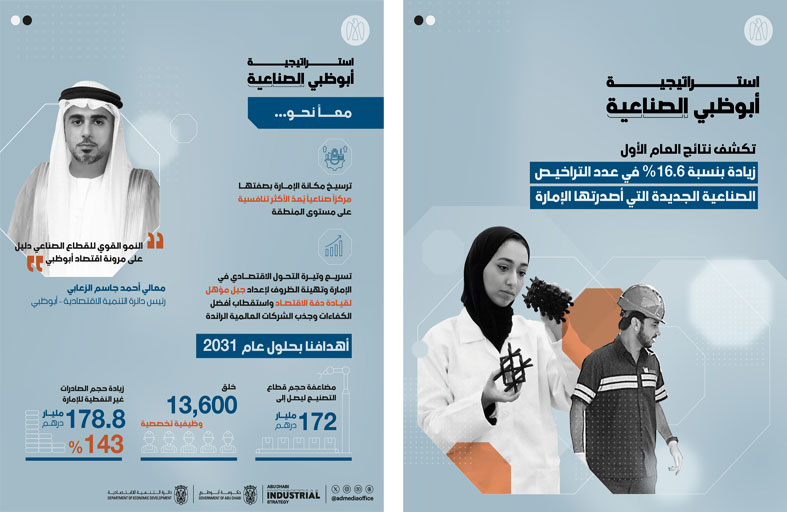 وتهدف استراتيجية أبوظبي الصناعية، التي تُشرف دائرة التنمية الاقتصادية – أبوظبي على تنفيذها، إلى ترسيخ مكانة الإمارة بوصفها المركز الصناعي الأكثر تنافسيةً في المنطقة، ومضاعفة حجم القطاع إلى 172 مليار درهم، وتوفير أكثر من 13,600 فرصة وظيفية تخصصية، والإسهام في زيادة الصادرات غير النفطية إلى 178.8 مليار درهم بحلول عام 2031.