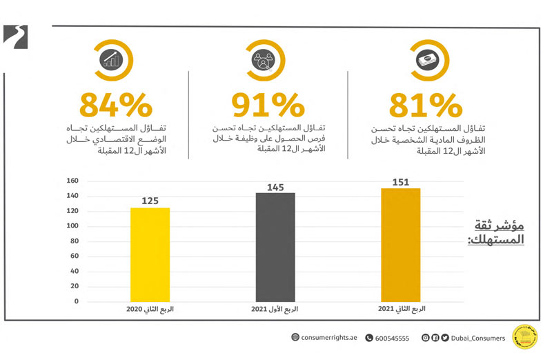 أكدت دائرة التنمية الاقتصادية في دبي أن مؤشر ثقة المستهلك في الإمارة حقق ارتفاعاً خلال الربع الثاني من 2021 إلى أعلى مستوى له منذ إطلاقه في عام 2011، حيث سجل 151 نقطة خلال الربع الثاني من 2021، مقارنةً بـ 125 نقطة في نفس الفترة من العام الماضي و145 نقطة من الربع الأول لعام 2021. وكشف محمد علي راشد لوتاه، المدير التنفيذي لقطاع الرقابة التجارية وحماية المستهلك في اقتصادية دبي، أن المؤشر شهد ارتفاعاً بشأن تصورات المستهلكين حول فرص الحصول على وظيفة، حيث أبدى 75% من المستهلكين تفاؤلهم مقارنةً بنسبةـ 32% لنفس الفترة من عام 2020. كما ارتفع تفاؤل المستهلكين حول فرص الحصول على وظيفة خلال الأشهر الـ12 المقبلة، حيث أبدى 91% منهم تفاؤلهم مقارنةً بـ 75% لنفس الفترة من العام الماضي. وكانت أكثر الفئة العمرية من 40-49 سنة الأكثر تفاؤلاً بالحصول على وظيفة بنسبة 81%.