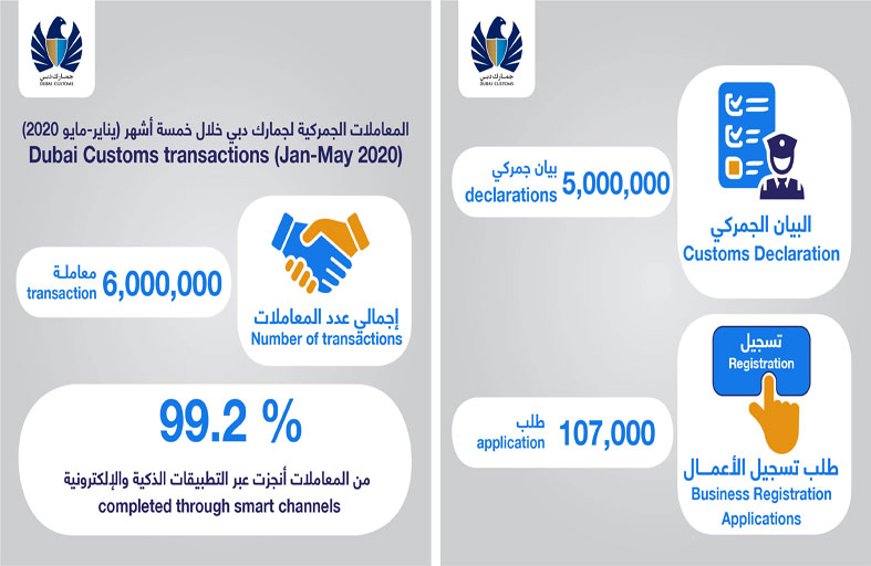 واصل اقتصاد دبي زخمه على الرغم من تداعيات انتشار جائحة كرونا عالمياً، حيث قفزت المعاملات الجمركية التي أنجزتها جمارك دبي بواقع 36 % للأشهر الخمسة الأولى من العام الجاري لتصل إلى 5.9 مليون معاملة مقارنة مع 4.4 مليون معاملة للفترة ذاتها من العام الماضي، وسجل عدد المعاملات لشهر مايو الماضي 1.1 مليون معاملة جديدة ، مقارنة مع 994 ألف معاملة في مايو 2019، وبنمو 10.6 % ، ويعكس نمو المعاملات في ظل الإجراءات والتدابير الاحترازية العالمية نجاح إمارة دبي في الاستجابة لتداعيات كورونا والحد من آثارها على القطاعات الاقتصادية بشكل عام والقطاع التجاري خصوصاً، وذلك بفضل بنيتها اللوجستية المتطورة، خدماتها الذكية ومبادراتها التحفيزية.