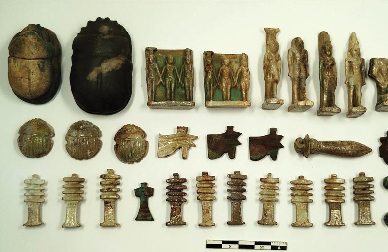 وأوضح الدكتور حسان إبراهيم عامر، الأستاذ بكلية الآثار جامعة القاهرة ومدير حفائر البعثة، أنه في إحدى المقابر المكتشفة، تم العثور على جعران القلب موجود في مكانه داخل المومياء، بالإضافة إلى العثور على 29 تميمة لعامود جد، وجعارين لبعض المعبودات مثل حورس وجحوتي وإيزيس، وتمائم تجمع بين الثلاثة معبودات معاً. وقال الدكتور استر بونس ميلادو رئيس البعثة من الجانب الإسباني إنه خلال أعمال الحفائر استطاعت البعثة العثور على بئر للدفن من الحجر مستطيل الشكل يؤدي إلى مقبرة من العصر البطلمي تحتوي على صالة رئيسية تؤدي إلى ثلاث حجرات بداخلها عشرات المومياوات متراصة جنباً إلى جنب، مما يشير إلى أن هذه الحجرات كانت قد استخدمت جميعها كمقبرة جماعية.
