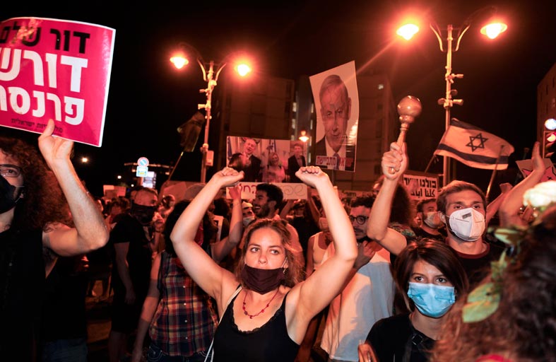 تظاهر آلاف الاسرائيليين ضد رئيس الوزراء بنيامين نتانياهو في أماكن متفرقة من البلاد مطالبين باستقالته في ظل اتهامات الفساد التي وجهت إليه وارتفاع الإصابات بفيروس كورونا.