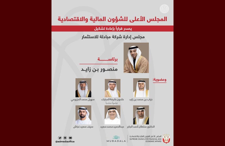أصدر المجلس الأعلى للشؤون المالية والاقتصادية قراراً بإعادة تشكيل مجلس إدارة شركة مبادلة للاستثمار برئاسة سمو الشيخ منصور بن زايد آل نهيان نائب رئيس مجلس الوزراء وزير ديوان الرئاسة. ويضم المجلس في عضويته كلاً من سمو الشيخ ذياب بن زايد آل نهيان ومعالي خلدون خليفة المبارك رئيس جهاز الشؤون التنفيذية عضو المجلس التنفيذي عضواً منتدباً ومعالي سهيل بن محمد فرج فارس المزروعي وزير الطاقة والبنية التحتية ومعالي الدكتور سلطان أحمد الجابر وزير الصناعة والتكنولوجيا المتقدمة ومعالي عبدالحميد محمد سعيد وسعادة سيف سعيد غباش أمين عام المجلس التنفيذي لإمارة أبوظبي.