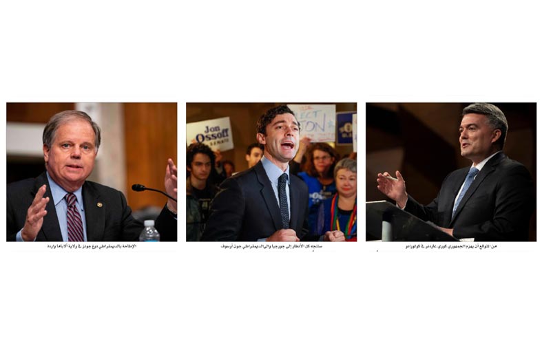 من المرجح أن يطيح الجمهوري تومي توبرفيل بالديمقراطي دوغ جونز في ولاية ألاباما. وأربعة جمهوريين مرشحون لنفس المصير: في كولورادو، الحاكم الديمقراطي السابق جون هيكنلوبر من المتوقع أن يهزم كوري غاردنر.