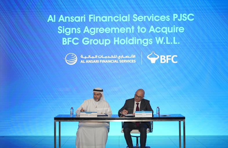أعلنت "الأنصاري للخدمات المالية"، المدرجة في سوق دبي المالي، توقيع اتفاقية بيع وشراء للاستحواذ على حصة 100% من مجموعة "بي إف سي القابضة"، التي تأسست في مملكة البحرين، بقيمة 200 مليون دولار (735 مليون درهم).