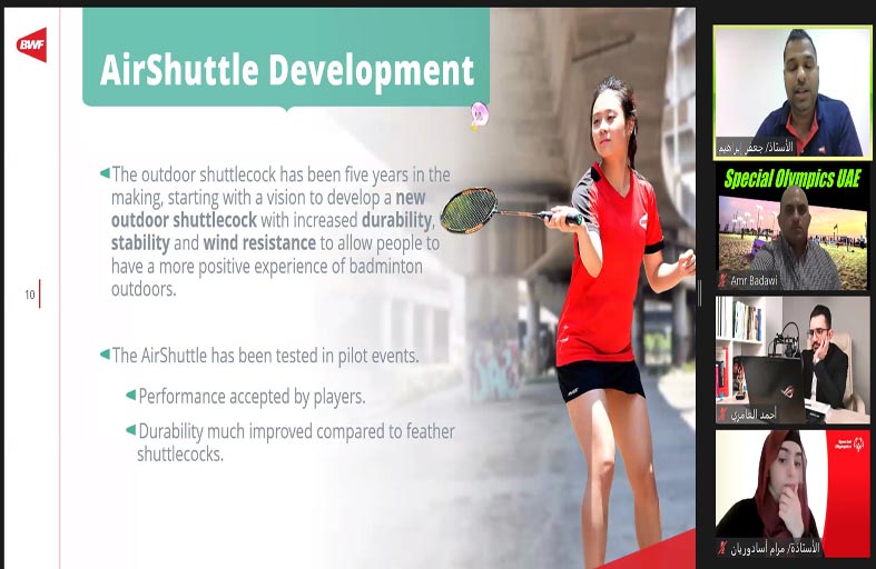 نظم الأولمبياد الخاص الإماراتي بالتعاون مع مركز إعداد القادة التابع للهيئة العامة للرياضة ندوة افتراضية تحت رعاية الاتحاد العربي للريشة الطائرة، حاضر فيها جعفر إبراهيم مدير التطوير بالاتحاد الدولي عن رؤية الاتحاد الدولي " BWF " حول رياضة الريشة الطائرة في الهواء من منظور العودة الآمنة للأنشطة الرياضية بعد " كوفيد-19 " .