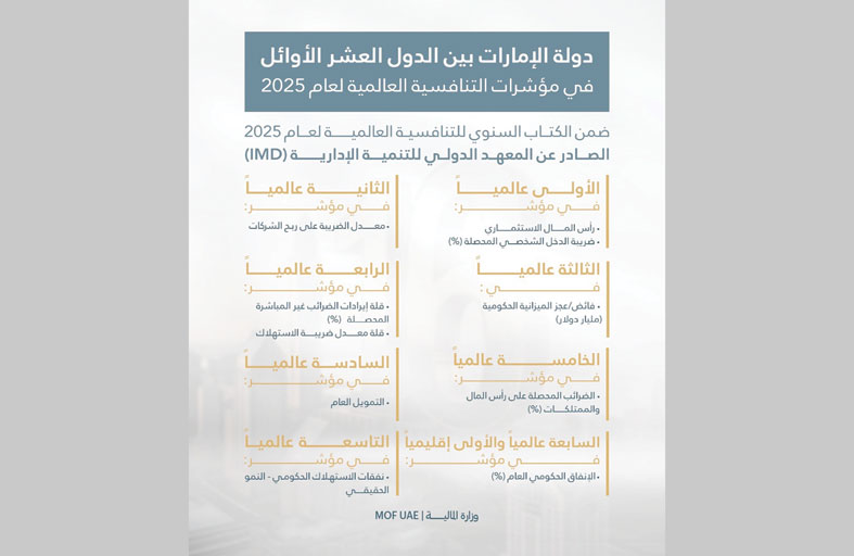 وشددت على أنها تولي أهمية كبيرة لتعزيز الشفافية المالية وتطوير البنية التحتية للبيانات الإحصائية، منوّهة إلى أن تعزيز موثوقية البيانات وتحسين مستوى الإفصاح المالي يمثلان ركيزة أساسية في تطوير السياسات العامة، ويعكسان التزام الدولة بأعلى معايير الحوكمة المالية بما يدعم الاستقرار الاقتصادي ويعزز من قدرة الدولة على التعامل مع المتغيرات العالمية بكفاءة ومرونة. وأكدت الوزارة أن دولة الإمارات تطمح إلى أن تكون ضمن قائمة الدول العشر الأوائل عالمياً في مؤشر الدعم الحكومي بحلول عام 2026، بفضل توجيهات القيادة الرشيدة وجهود فرق العمل الوطنية مشيرة إلى مواصلة ترسيخ نهج يستند إلى فاعلية الإنفاق العام والاستدامة المالية لدفع عجلة النمو في الدولة. ووفق الكتاب السنوي للتنافسية العالمية 2025 جاءت دولة الإمارات ضمن الدول العشر الأوائل عالمياً في عدد من مؤشرات التنافسية، مما يعكس الأداء المالي المتقدم للدولة. فقد حصدت الإمارات المرتبة الأولى عالمياً في مؤشري رأس المال الاستثماري، ونسبة ضريبة الدخل الشخصي المحصلة وجاءت في المرتبة الثانية في مؤشر معدل الضريبة على ربح الشركات، والمرتبة الثالثة في مؤشر فائض/عجز الميزانية الحكومية “مليار دولار” واحتلت المرتبة الرابعة في نسبة انخفاض إيرادات الضرائب غير المباشرة المحصلة، وانخفاض معدل ضريبة الاستهلاك. كما جاءت الدولة في المرتبة الخامسة في مؤشر نسبة الضرائب المحصلة على رأس المال والممتلكات، والمرتبة السادسة في مؤشر التمويل العام، والسابعة عالمياً والأولى إقليمياً في مؤشر نسبة الإنفاق الحكومي العام، والتاسعة عالمياً في مؤشر نفقات الاستهلاك الحكومي - النمو الحقيقي. وتؤكد هذه الإنجازات تفوق دولة الإمارات في التنافسية العالمية، وتعكس التزامها بتطوير بيئة اقتصادية مستدامة، وقدرتها على مواكبة التحديات والتكيف مع المتغيرات الاقتصادية، مما يعزز مكانتها الريادية عالمياً.