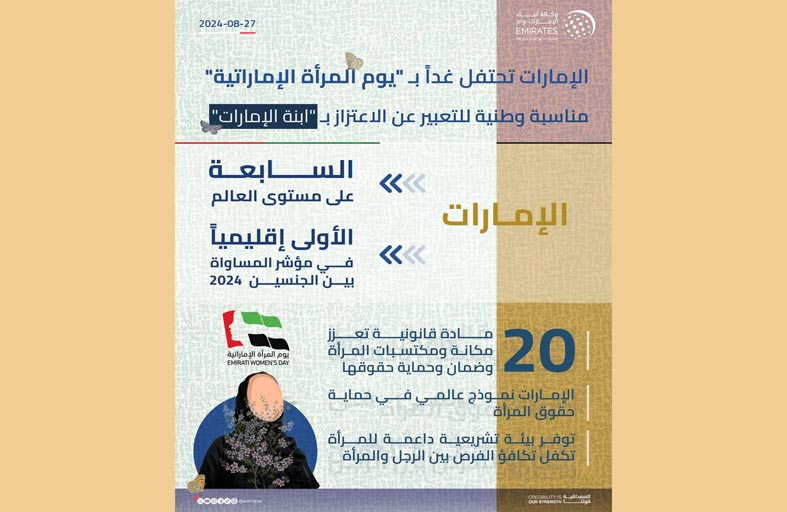 تحتفل دولة الإمارات، اليوم الأربعاء بـ " يوم المرأة الإماراتية"، الذي يمثل مناسبة وطنية للتعبير عن الاعتزاز بـ "ابنة الإمارات"، التي تعيش عصرها الذهبي في ظل الاهتمام والرعاية اللامحدودة من قبل القيادة الرشيدة، التي وضعت ثقة لا محدودة في قدرة المرأة على العطاء في مختلف المجالات ومهدت لها البيئة الداعمة لتمكينها من التميز والنجاح.ويأتي احتفال هذا العام تحت شعار “نتشارك للغد”، بناء على توجيهات سمو الشيخة فاطمة بنت مبارك “أم الإمارات”، رئيسة الاتحاد النسائي العام، رئيسة المجلس الأعلى للأمومة والطفولة، الرئيسة الأعلى لمؤسسة التنمية الأسرية، وذلك تأكيداً على النهج التشاركي الذي تعمل عليه الدولة منذ أن وضع لبناته الأولى الآباء المؤسسون عبر إشراك جميع فئات المجتمع من أفراد ومؤسسات في تحقيق رؤية الدولة.