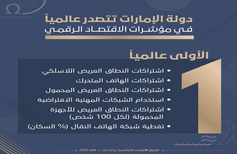 وتضمنت قائمة مؤشرات التنافسية التي حازت فيها الدولة على موقع الصادرة الدولية بتبوئها المرتبة الأولى عالمياً في الاقتصاد الرقمي كلاً من مؤشر اشتراكات النطاق العريض اللاسلكي، ومؤشر اشتراكات الهاتف المتحرك، في مؤشر مسح الحكومة الإلكترونية الذي أجرته الأمم المتحدة، كما تربعت الدولة في المركز الأول عالمياً في مجموعة من مؤشرات التقارير التي يصدرها المنتدى الاقتصادي العالمي مثل مؤشر اشتراكات النطاق العريض المحمول، في تقرير التنافسية العالمية 4.0، ومؤشر اشتراكات الإنترنت ذات النطاق العريض المحمول لكل 100 نسمة، وكذلك تغطية شبكة الهاتف النقال /كنسبة مئوية من السكان/ في تقرير تنافسية السياحة والسفر. كما جاءت دولة الإمارات في المركز الأول عالمياً في مؤشر النطاق العريض اللاسلكي في تقرير التنافسية الرقمية العالمية الصادر عن المعهد الدولي للتنمية الإدارية.