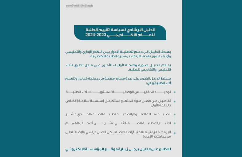 الإمارات للتعليم المدرسي تصدر دليلاً إرشادياً حول سياسة تقييم أداء الطلبة للعام الدراسي 2023-2024