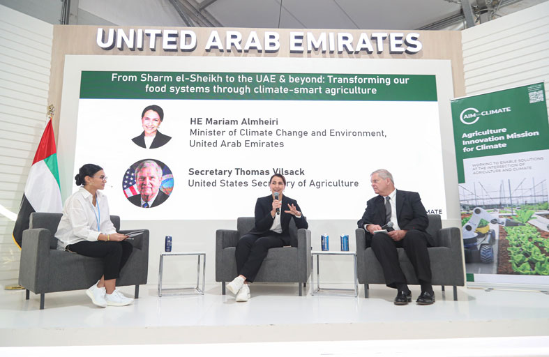 وأضافت: “ دعماً لهذه الأولوية الاستراتيجية اطلقت الإمارات بالتعاون مع الولايات المتحدة الأمريكية مبادرة الابتكار الزراعي من أجل المناخ بشكل رسمي ضمن أعمال COP26 في غلاسكو بالمملكة المتحدة، وتعلن المبادرة عن تطوير 30 برنامجا لتسريع تبني الابتكارات الزراعية الذكية مناخيا من خلال تحفيز استثمارات في النظم الزراعية والغذائية الذكية مناخياً بقيمة 4 مليارات دولار، وضمن فعاليات إكسبو 2020 المنعقد في دبي، وخلال الاجتماع الوزاري الأول للمبادرة، تم استهداف رفع سقف الاستثمارات المستهدف تحفيزها بحلول دورة مؤتمر دول الأطراف COP27 إلى 8 مليارات دولار لضمان إحداث فارق إيجابي واسع عالميا عبر المبادرة.»