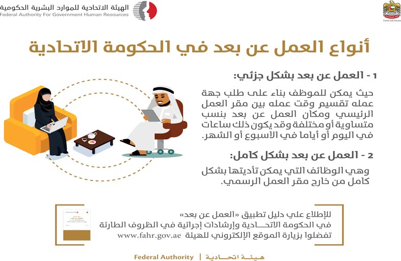 ويهدف دليل العمل عن بعد إلى الحفاظ على سلامة الموظفين، وتمكين الجهات الاتحادية من تطبيق قرار العمل عن بعد الذي صدر مؤخراً عن حكومة دولة الإمارات، وضمان استمرارية تأدية الأعمال وتقديم كافة الخدمات الحكومية في ظل الظروف الطارئة، حيث يتضمن الدليل إرشادات وخطوات عملية يمكن اتخاذها من قبل الجهات الاتحادية عند تطبيق العمل عن بعد.
